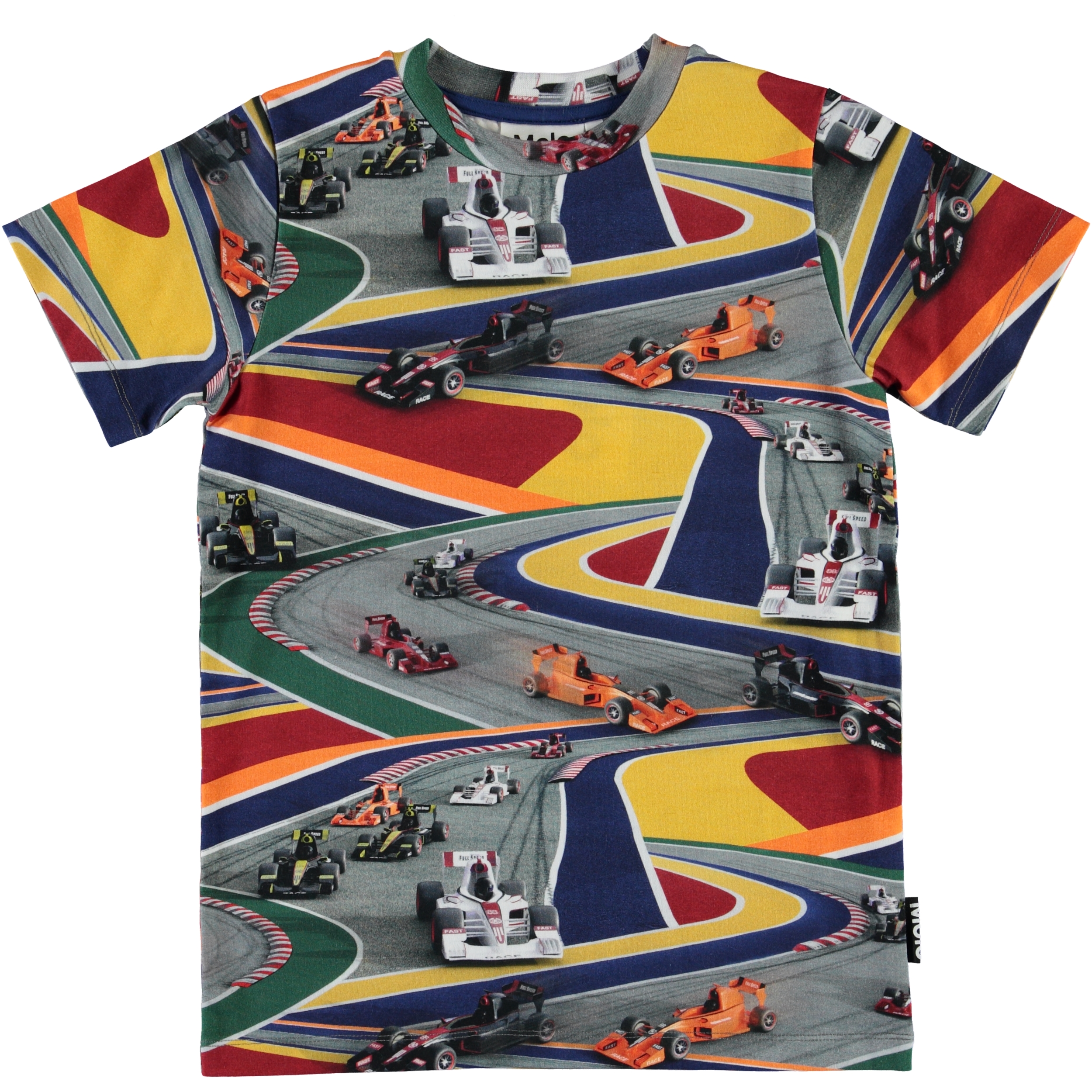 Ralphie er en t-shirt med farverigt all-over print af racerbiler i fuld fart som kører om kap mod hinanden.