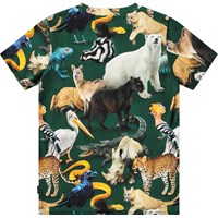 Multifarvet t-shirt i økologisk bomuld med korte ærmer og en rund halsudskæring med ribkant. T-shirten har en almindelig pasform og et alloverprint af en masse forskellige dyr på en grøn baggrund.