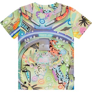 T-shirt i multifarvet alloverprint i økologisk bomuld. På det detaljerede og farverige flippermaskine-print, er der masser at se. Kan du fx finde kuglen i virvaret af lysende lamper, aliens, palmer og flotte tigre? T-shirten har en rund halsudskæring med ribkant, samt en almindelig pasform.
