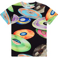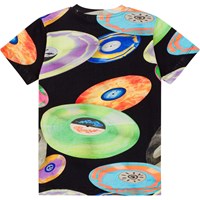 T-shirt i multifarvet alloverprint i økologisk bomuld. På printet ses flotte og farvestrålende vinylplader, svævende rundt på en sort baggrund. T-shirten har en rund halsudskæring med ribkant, samt en almindelig pasform.