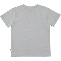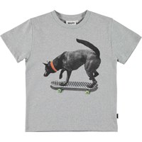 Rame er en grå T-shirt med et sort/hvid print af en hund på et skateboard. Hunden har et rødt halsbånd på og hjulene på skateboardet er grønne.