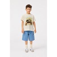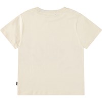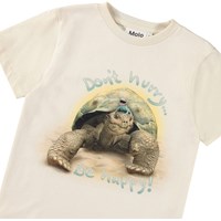 Råhvid t-shirt i blødt økologisk bomuld med ribkant i halsen. T-shirten har en løs pasform med et frontprint af en skildpadde samt et firben og teksten "Don't hurry... Be Happy".