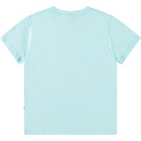 Lyseblå t-shirt i blødt økologisk bomuld med ribkant i halsen. T-shirten har en løs pasform med et frontprint af en flyvende fodbold i målet.