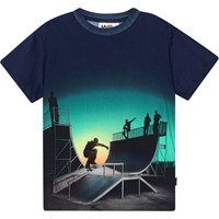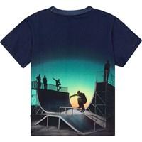 Mørkeblå t-shirt med placementprint for front og ryg i økologisk bomuld. Printet er et full front placementprint med vert (vertical) skatere i gang med en aftensession i solnedgangen. Printet fortsætter på ryggen. Rame har rund halsudskæring med ribkant og en almindelig pasform.