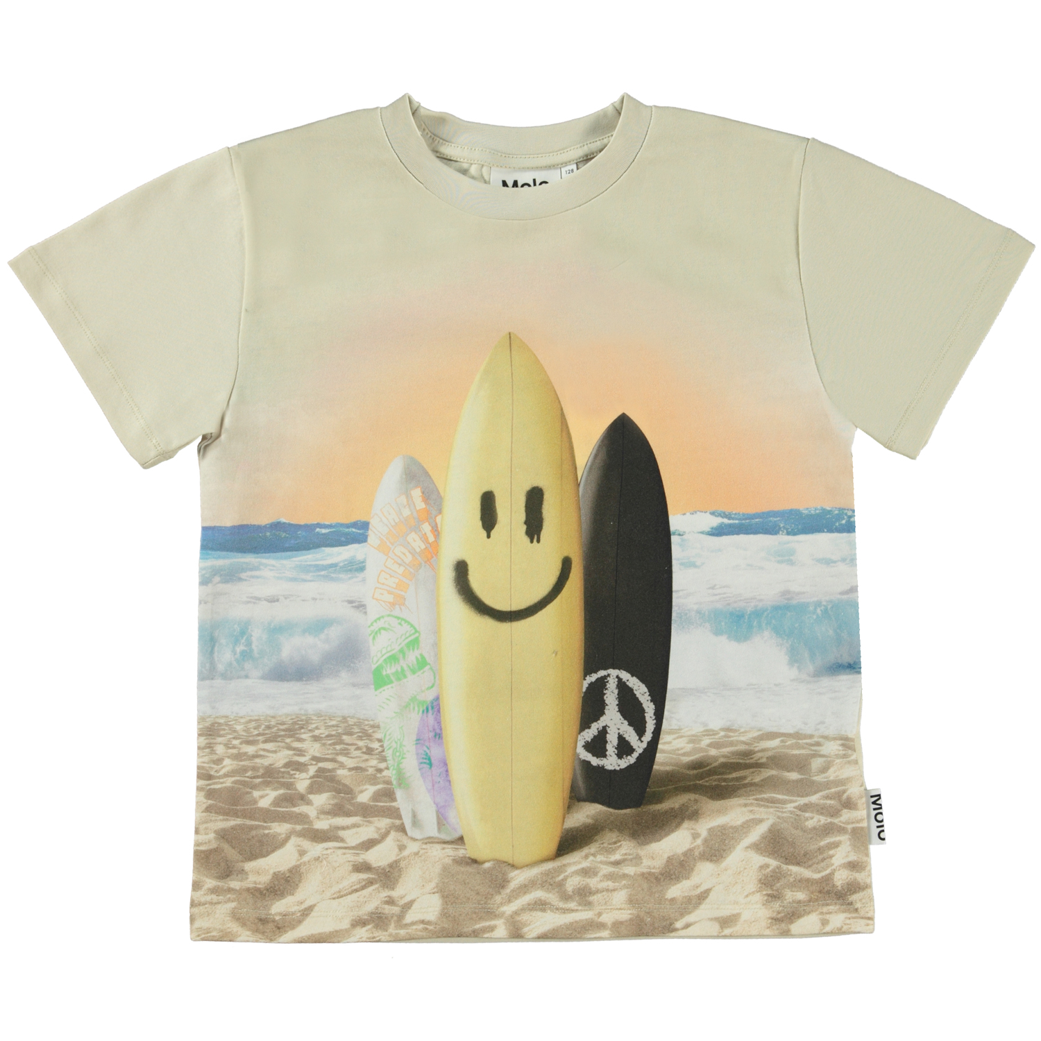 Rame er en sandfarvet t-shirt med surfboard print på forsiden. Surfbrædderne står i sandet med det brusende hav i baggrunden.