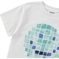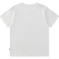Hvid t-shirt i økologisk bomuld med korte ærmer og ribkant i halsen.T-shirten har en løs pasform og et print af et smilende ansigt i turkisblå.