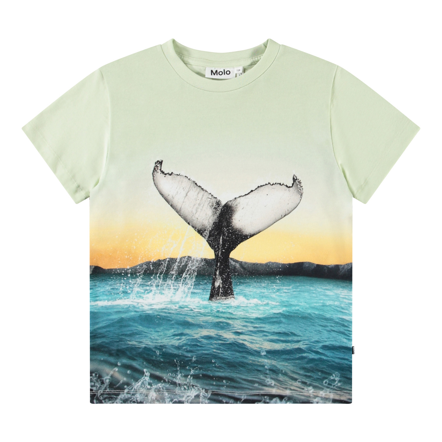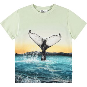 Lysegrøn t-shirt i blødt økologisk bomuld med ribkant i halsen. T-shirten har en løs pasform med et frontprint af en blåhvals hale og det store åbne hav.