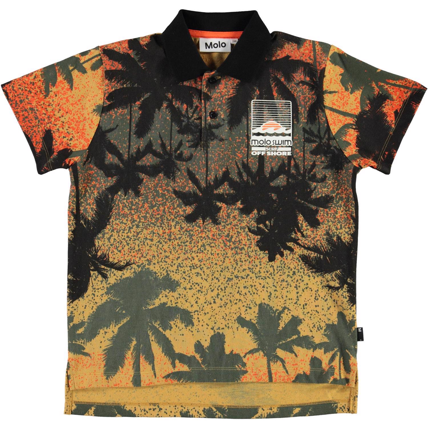 Ramon er en orange og grøn polo t-shirt med print af palmer og grafisk solnedgang. T-shirten har sort krave og knappelukning. T-shirten er i 100% bomuld.