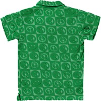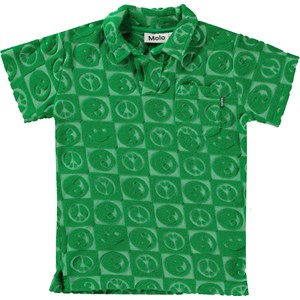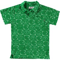 Grøn frotté polotrøje i en blød bomuldsblanding med ternet mønster. I mønstret ses smilende emojis, yin og yang symboler og peacetegn. Polotrøjen har en løs pasform samt korte ærmer, polokrave, brystlomme og små slidser i siden. Den bløde frotté og løse pasform gør den ideel til at tage med på stranden eller til poolen.