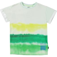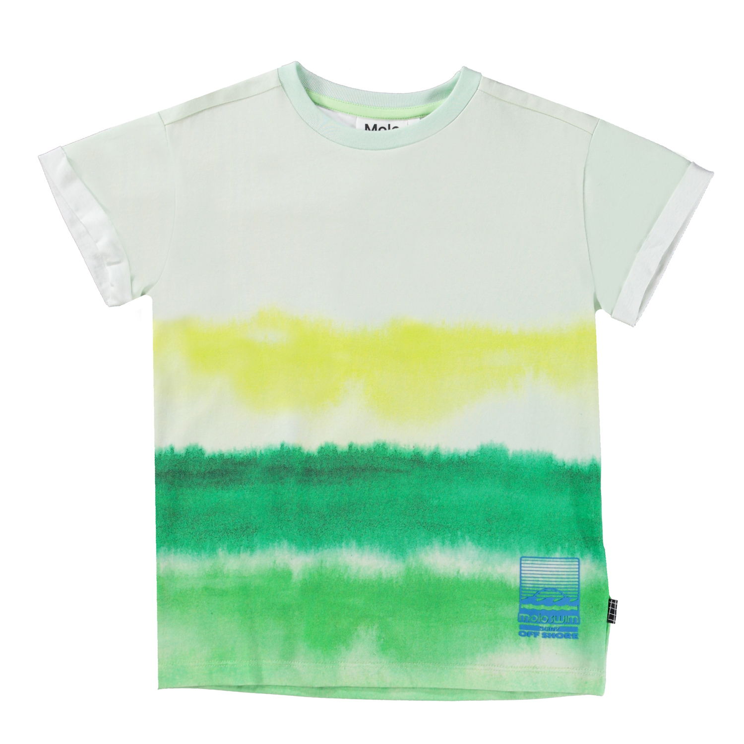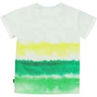 Hvid T-shirt i 100% økologisk bomuld med placeret print i grønne og gule nuancer. Printet forestiller brede akvarelmalede striber som fortsætter på bagsiden. T-shirten har korte ærmer med opsmøg, samt en almindelig pasform.