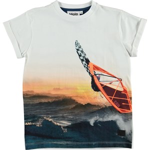 Der er surf og solnedgang her på t-shirten Randon. T-shirten er i 100% bomuld og har opsmøgede ærmer. Kombiner Randon med et par Molo badeshorts med farverigt surf print for et cool look.