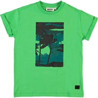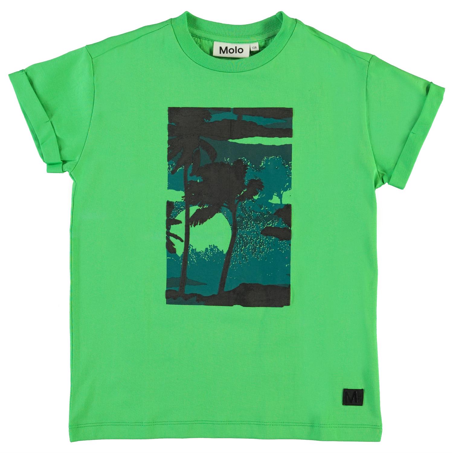 Randon er en grøn t-shirt med print af palmer og solnedgang på fronten. T-shirten er i 100% bomuld og har opsmøgede ærmer. T-shirte.