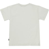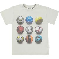 Rasmus er en knækket hvid t-shirt med print af forskellige fodbolde på fronten.