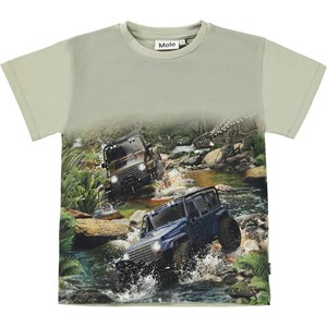 Rasmus er en beige t-shirt med print af jeeps på fronten.