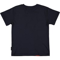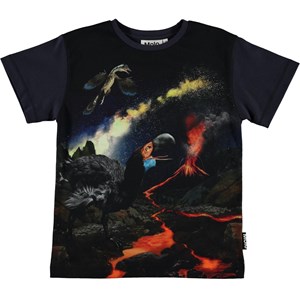 Printet på t-shirten Rasmus rejser tilbage i tiden med vilde fugle og øgler. T-shirten er sort med korte ærmer.