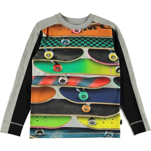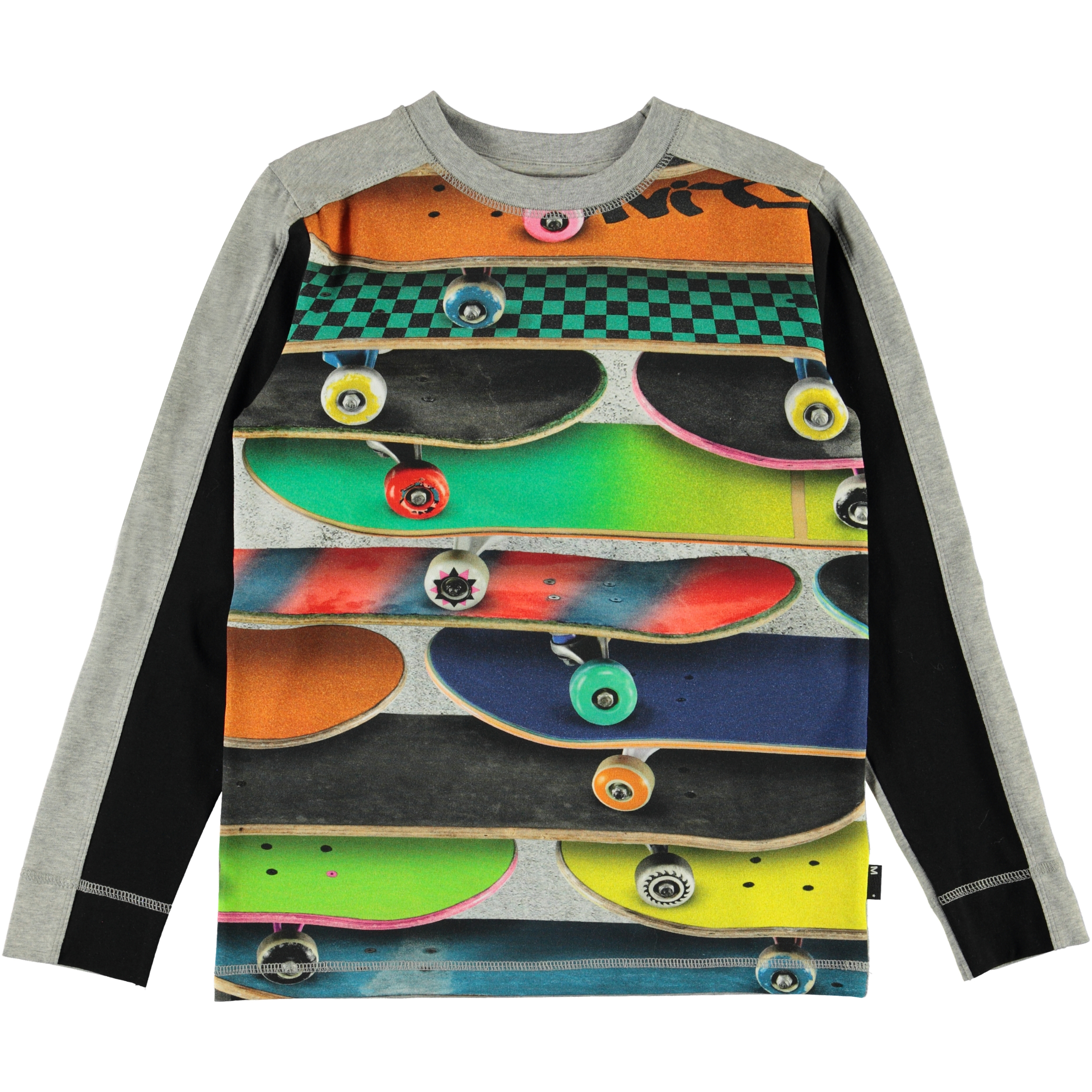 Skateboardene er stablet her på blusen Raso, som har tofarvede ærmer i sort og grå.