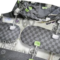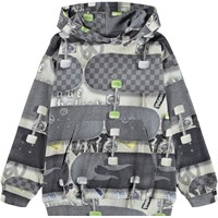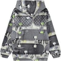 Hættetrøje med skateboard print i grå nuancer i økologisk bomuld. Trøjen har lange ærmer, dobbeltforet hætte, bred ribkant ved ærme og hofte samt en kængurulomme på fronten.