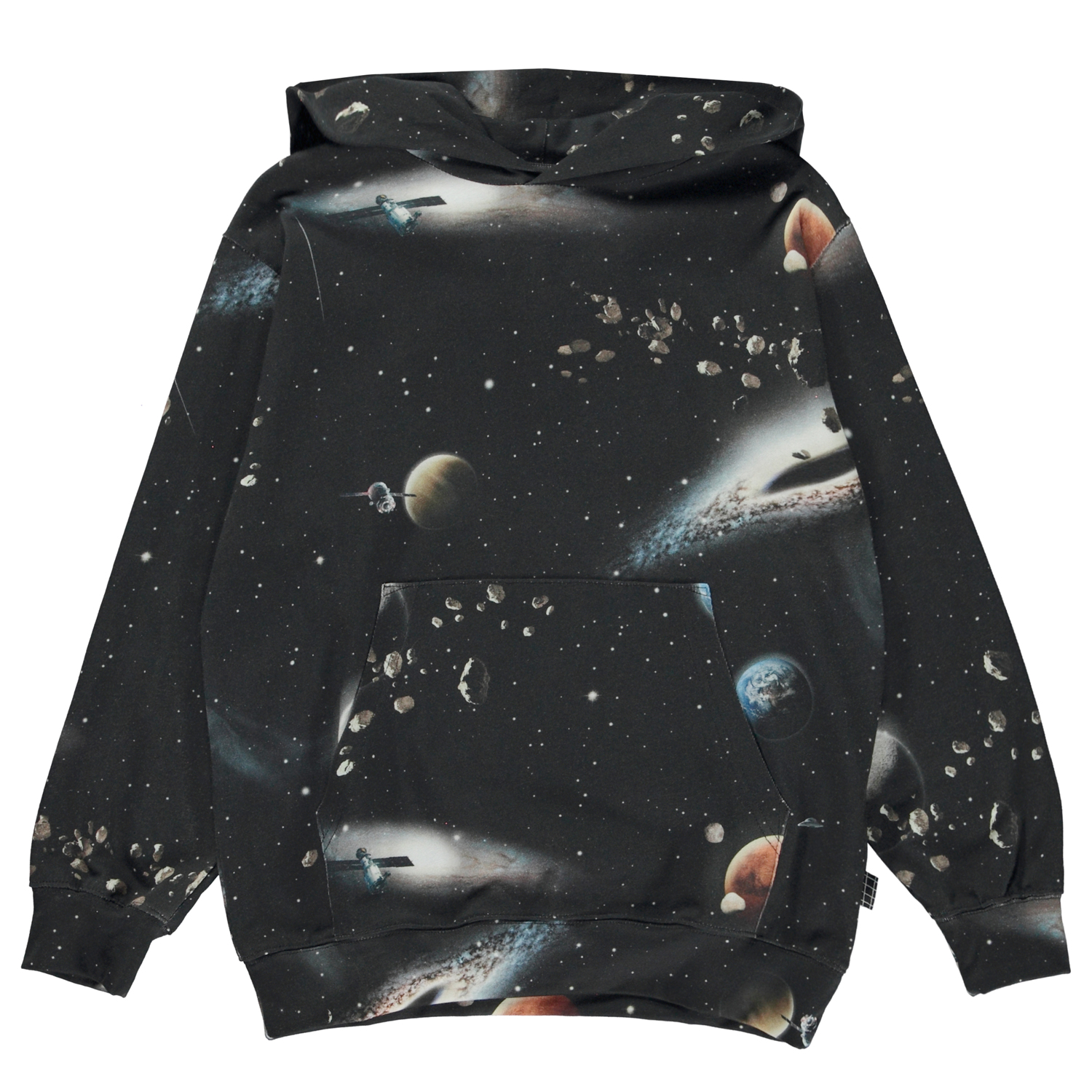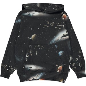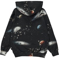 Sort hættetrøje i allover space print. På printet kan du se dybt ud i rummet. Du kan se både stjerner og planeter, men du kan også se endnu længere, helt derud til hvor der er nye galakser, satellitter og sorte huller. Derude, hvor eventyret venter. Denne hættetrøje er fremstillet i 100% bomuld. Hættetrøjen har lange ærmer, hætte, bred ribkant ved ærme og hofte, en kængurulomme på fronten, samt et regulært fit.