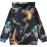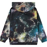 Multifarvet hættetrøje i økologisk bomuld med lange ærmer, hætte, bred ribkant ved ærme og hofte samt en kængurulomme på fronten. Trøjen har en almindelig pasform og et alloverprint inspireret af et billede fra James Webb-rumteleskopet, der forestiller det ydre rum. Hvis du ser godt efter, kan du måske få øje på nogle fritsvævende satellitter.