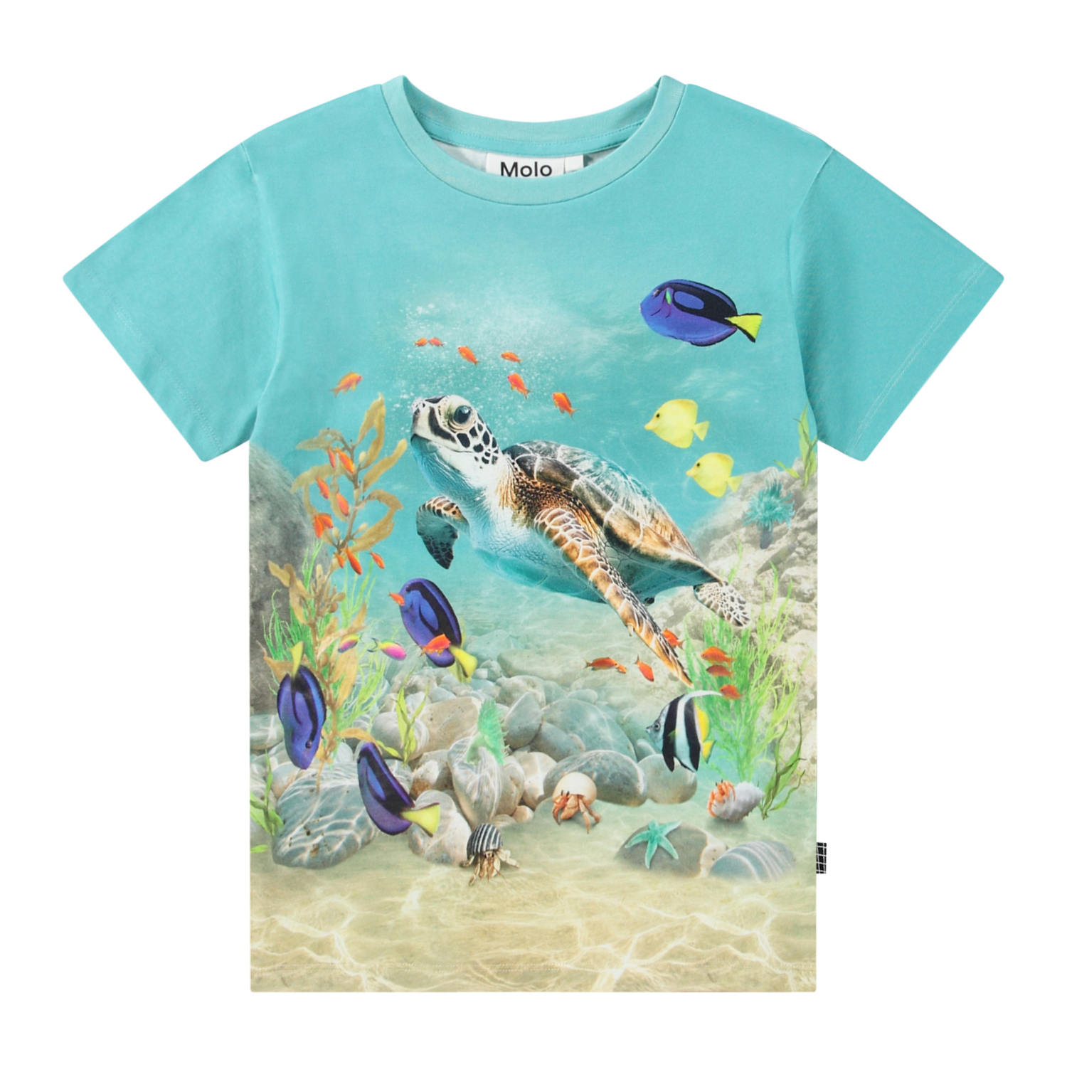 Turkisblå t-shirt i økologisk bomuld med korte ærmer og ribkant i halsen. T-shirten har en løs pasform og et print af et farverigt koralrev med fisk og havskildpadder.
