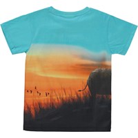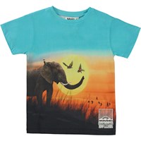 Raul er en blå t-shirt med print af en glad sol og en elefant. T-shirten har korte ærmer og en rund halsudskæring.