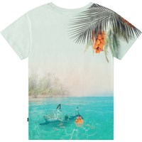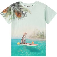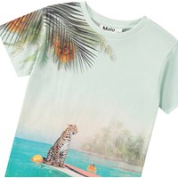 Lyseblå t-shirt i økologisk bomuld med korte ærmer og ribkant i halsen. T-shirten har en løs pasform og et print af en smuk strand og en gepard på et surfboard.