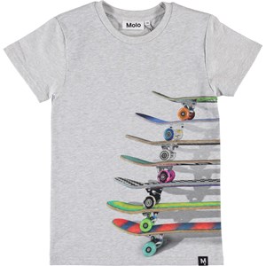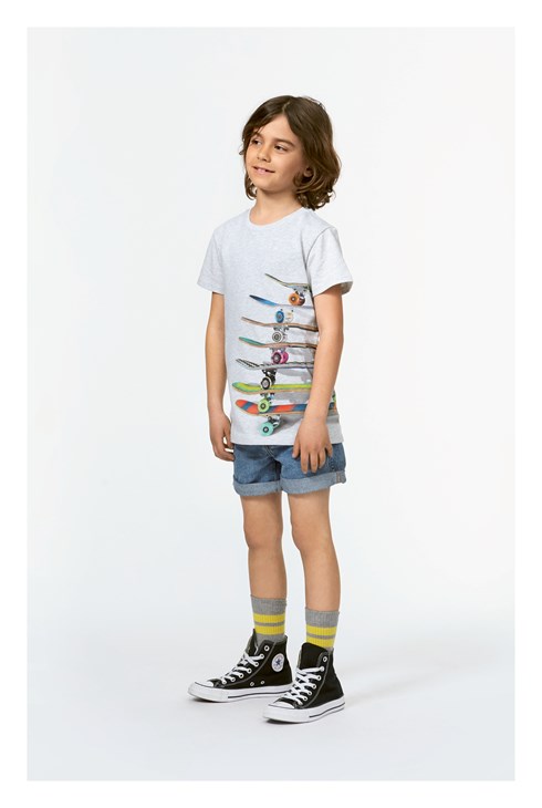 De farverige skateboards er stablet flot her på den grå t-shirt Raven. Raven er i 100% bomuld og har korte ærmer.