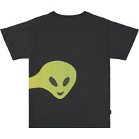 Sort t-shirt med gulgrønt print på for- og bagside, der forstiller bobler med smilende ansigter og aliens. Denne t-shirt er fremstillet i 100% økologisk bomuld, har korte ærmer, rund halsudskæring med ribkant, samt et regulært fit.