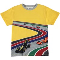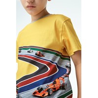 Der bliver kørt stærkt i racer bilerne på den gule t-shirt Raveno. Printet på t-shirten fortsætter om på ryggen.