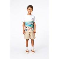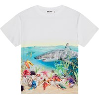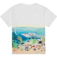 Hvid t-shirt med et farvestrålende placementprint på front og ryg i økologisk bomuld. På printet kan du se en flot og sej hvidhaj og dens hajven, der tager sig en svømmetur i det klare vand. T-shirten har ingen sidesøm i venstre side så hajerne kan uforstyrret svømme hele t-shirten rundt. Mon de også er fascinerede af de sjove eremitkrebs der selv har fundet deres skaller at bo i? Og kan du få øje på hajæggene? T-shirten har en rund halsudskæring med ribkant og en almindelig pasform.
