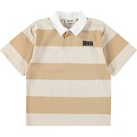 Rugby t-shirt i blød, økologisk bomuld med ribkanter, hvid skjortekrave og en lille stolpelukning med tre skjulte knapper. Trøjen har en almindelig pasform med vandrette brede striber i beige og hvid med Molos logo på brystet.