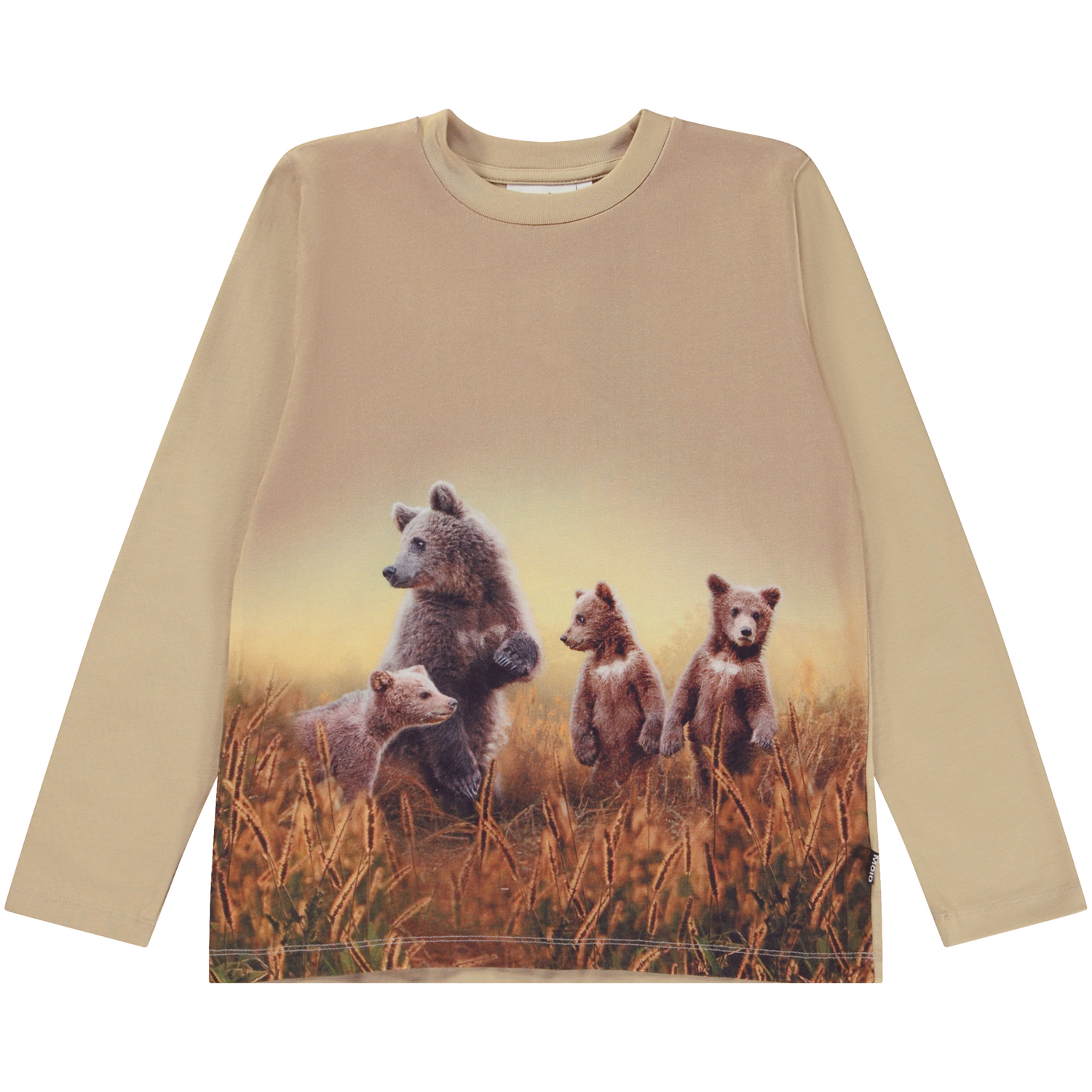 Beige langærmet t-shirt med frontprint. På printet ses en bjørne familie, der ser ud til at lede efter noget. Måske deres venner, eller en lækker honningkrukke? Hvad tror du? Denne langærmede t-shirt er fremstillet af 100% bomuld, har en rundhalsudskæring, samt et regulært fit.