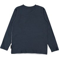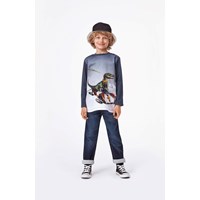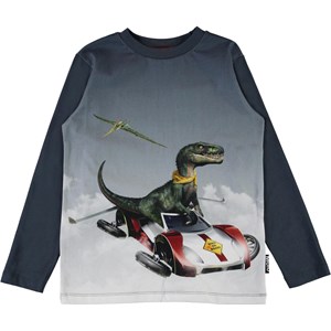Fremtiden og fortiden er forenet i printet på blusen Reif, hvor en dinosaur styrer en flyvende bil. Reif har mørkeblå lange ærmer og en rund halsudskæring.