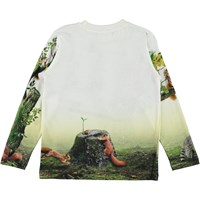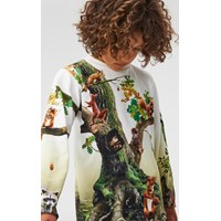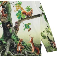 Reif er en hvid langærmet bluse med print af et stort træ med masser af egern og nødder. Egern elsker nødder og nogle af dem har samlet en masse sammen og gemt dem godt. Kig efter på blusen og se om du kan finde den største samler.