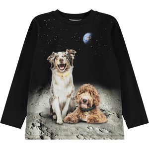 Sort bluse i blødt, økologisk bomuld med lange ærmer og ribkant ved halsen. Blusen har en løs pasform med et frontprint to glade hunde på månen.
