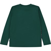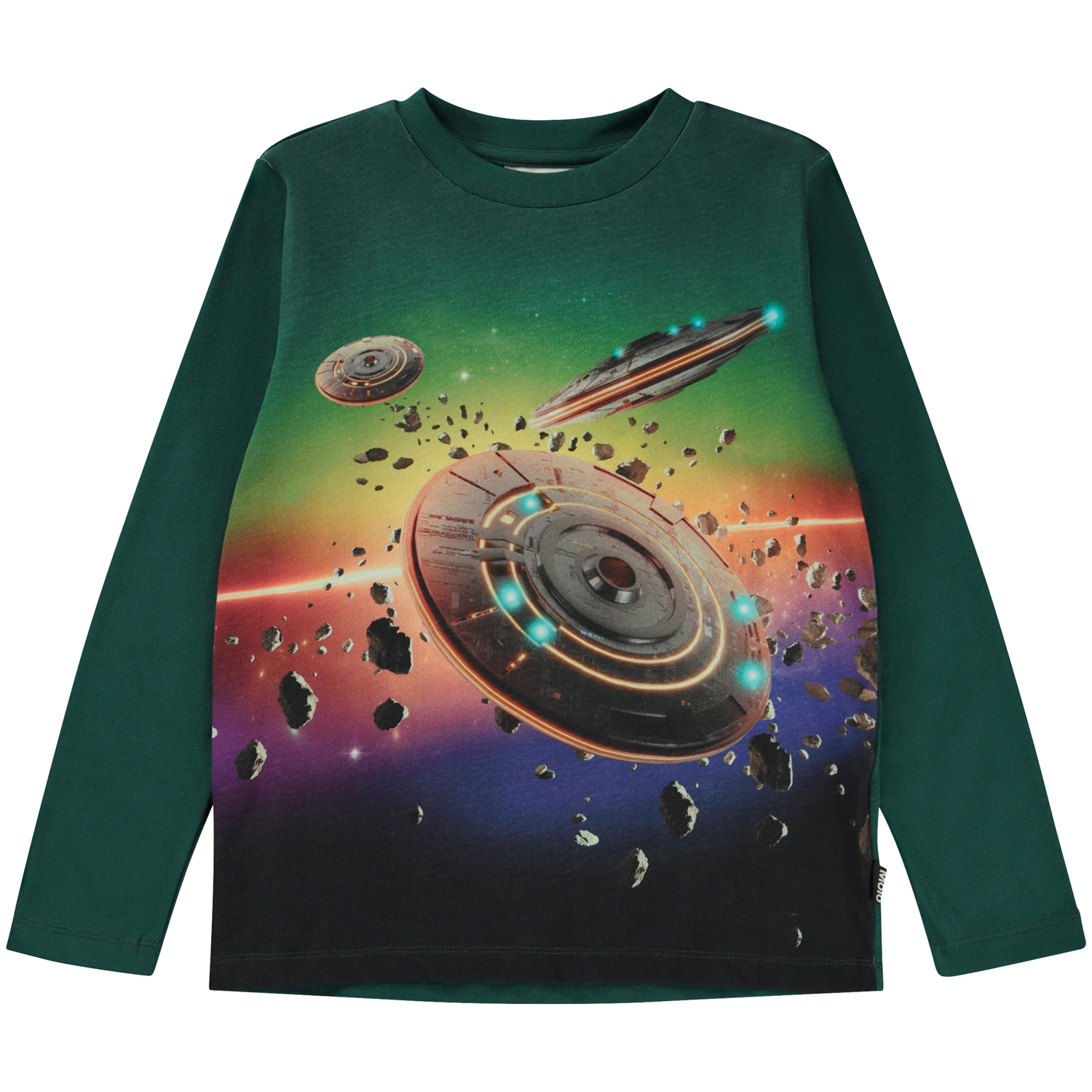 Grøn langærmet t-shirt med UFO frontprint. På printet ser man UFO’er, der flyver hurtigere end lysets hastighed. Pas på alle farerne derude! Man skal være en dygtig alien, for at kunne flyve sikkert igennem asteroidebæltet. Printet er i klare regnbuefarver. Denne langærmede t-shirt er fremstillet af 100% bomuld, har en rundhalsudskæring, samt et regulært fit.