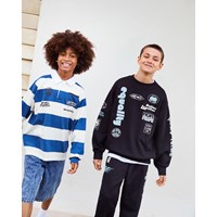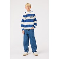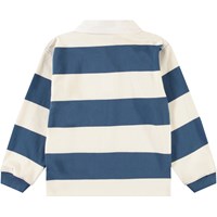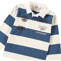 Bredstribet blå og hvid rugbytrøje i blødt økologisk bomuld. Trøjen har en almindelig pasform, lange ærmer med ribkant, en hvid skjortekrave og en lille stolpelukning med tre skjulte knapper, hvilket gør den nem at tage på. Trøjen har små sorte frontprint på brystet af kollektionens fine budskaber og temaer.