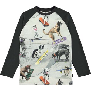 Har du nogensinde tænkt på hvad hunde laver, når de er alene? På den langærmede t-shirt, Remington med printet "Doggy Town" får du svaret. Her skater de forskellige hunde rundt på deres skateboards, laver ollies og har det sjovt med at jagte hinanden rundt på ramperne. Remington har sorte raglanærmer og hals, og hunde på skateboards på mave og ryg.