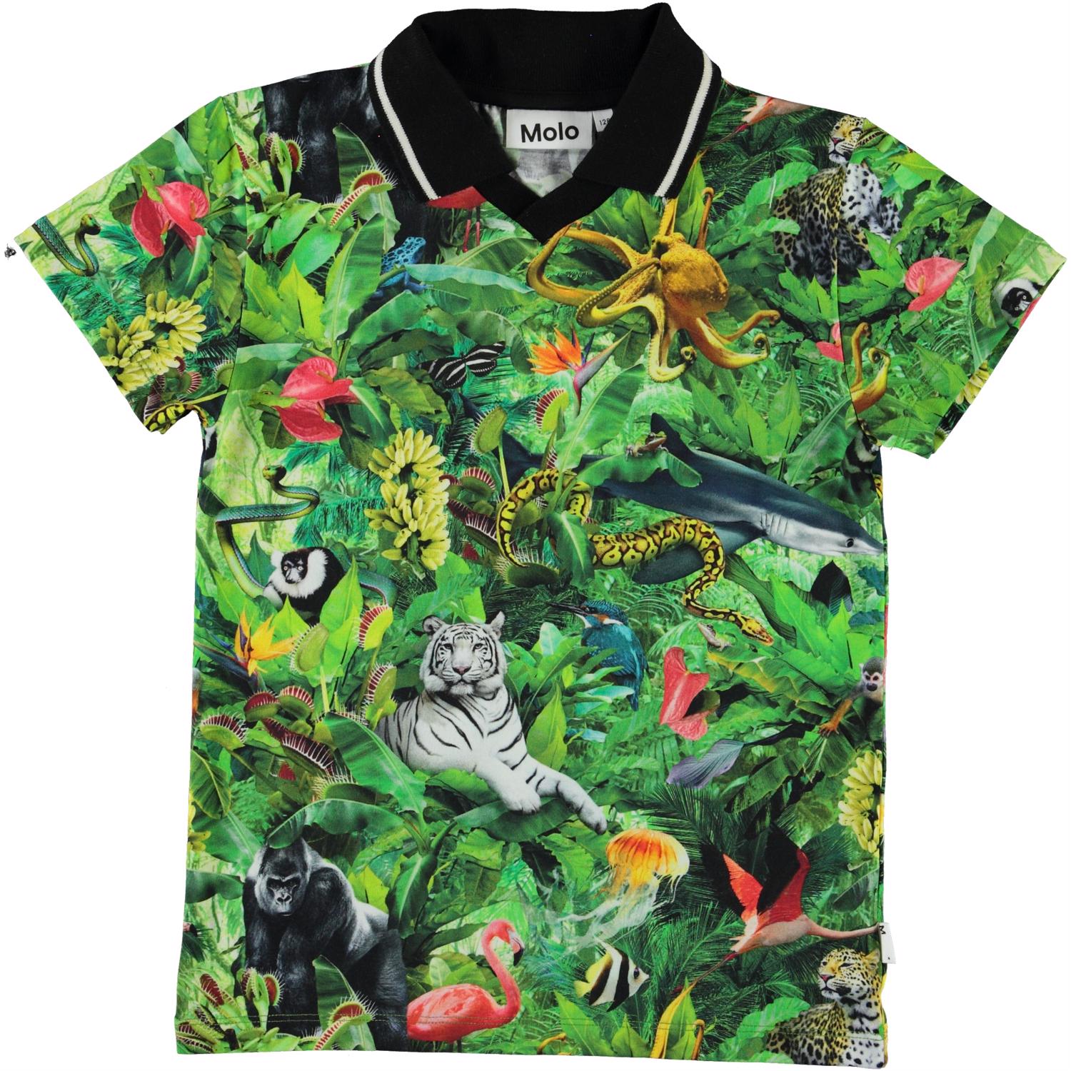 Ren er en polo t-shirt med printet 'Fantasy Jungle', hvor der er mange forskellige dyr i junglen, som ikke plejer at befinde sig der. Poloen har sort krave med hvid stribe.