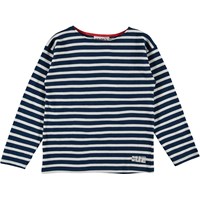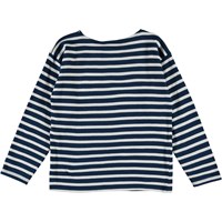 Rilder er en blå og hvid stribet bluse med lange ærmer.