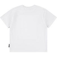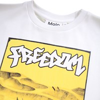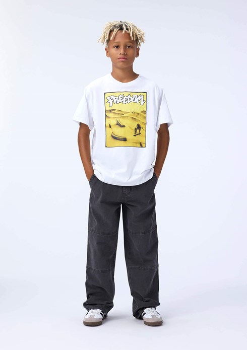 Hvid t-shirt i blødt økologisk bomuld med korte ærmer og ribkant i halsen. T-shirten har en løs pasform med et gult print af en skaterpark og ordet "Freedom" på fronten.