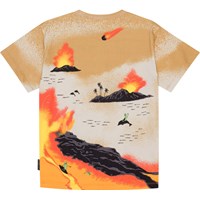 T-shirt med placementprint fremstillet i økologisk bomuld. På printet har den venlige alien taget sine venner med, og de har en fest med forskellige aktiviteter, i et landskab af palmeøer og ildsprudlende vulkaner. De små aliens lyser grønt op på en baggrund af sandfarver og gul og orange. Denne t-shirt har en rund halsudskæring, ribkant i halsen samt en løs pasform.