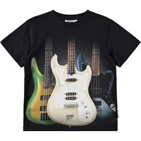 Sort t-shirt i blødt økologisk bomuld med korte ærmer og ribkant i halsen. T-shirten har en løs pasform med et print af farverige rockguitare.