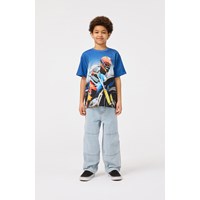Blå t-shirt i blødt økologisk bomuld med korte ærmer og ribkant i halsen. T-shirten har en løs pasform samt et front- og bagprint af en motocrosskører.