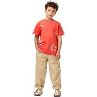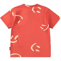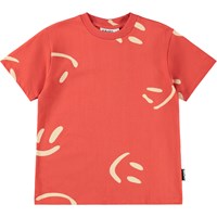 Rød t-shirt i blødt økologisk bomuld med korte ærmer og ribkant i halsen. T-shirten har en løs pasform med et print af smilende ansigter.