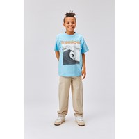 Riley er en blå t-shirt i økologisk bomuld, med print af en surfer, der rider på en bølge.