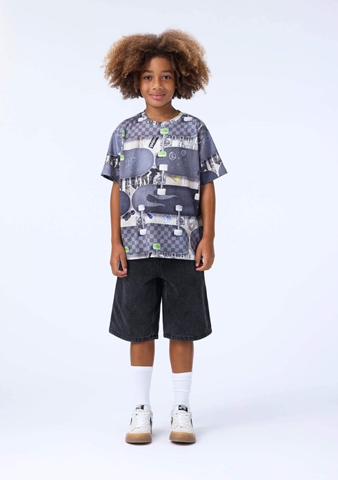 gråtonet t-shirt i blødt økologisk bomuld med korte ærmer og ribkant i halsen. T-shirten har en løs pasform med et print af skateboards.
