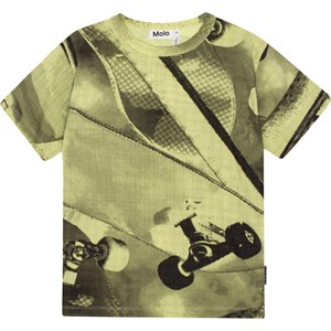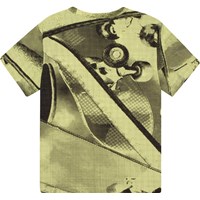 Gul t-shirt med sort alloverprint i økologisk bomuld. Printet er et 2-tonet abstrakt print, der viser et skateboard i næsten virkelig størrelse. T-shirten har en rund halsudskæring, ribkant i halsen og en løs pasform.