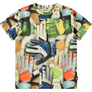 Farverig t-shirt i blød økologisk bomuld med korte ærmer og ribkant i halsen. T-shirten har en løs pasform med et allover print af farverige målmandshandsker.