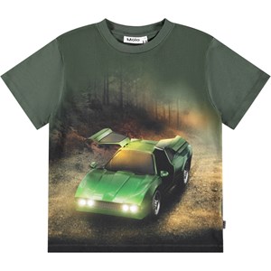 Mørkegrøn t-shirt i blødt økologisk bomuld med korte ærmer og ribkant i halsen. T-shirten har en løs pasform med et front print af en sportsvogn i skovens tåge.